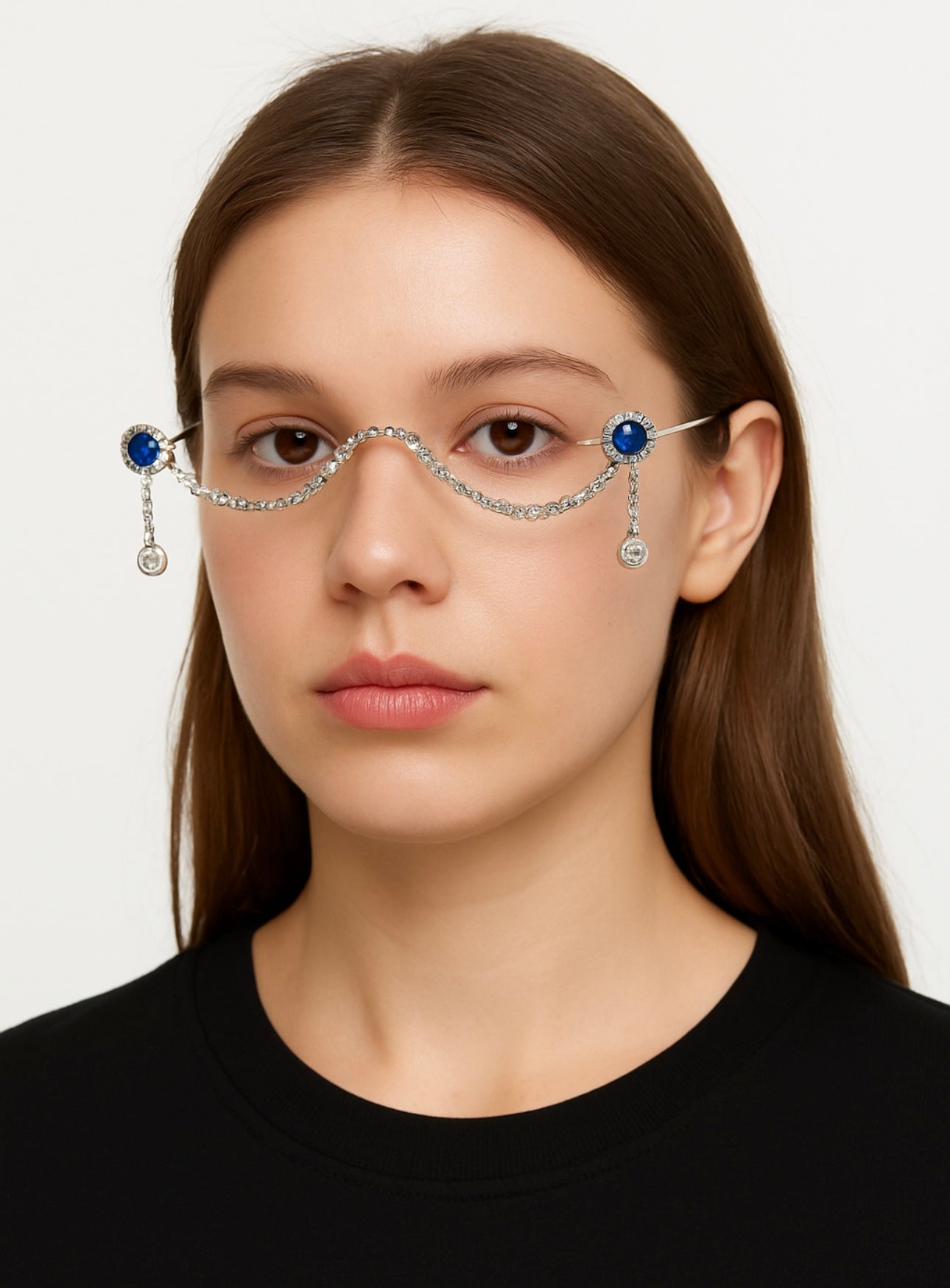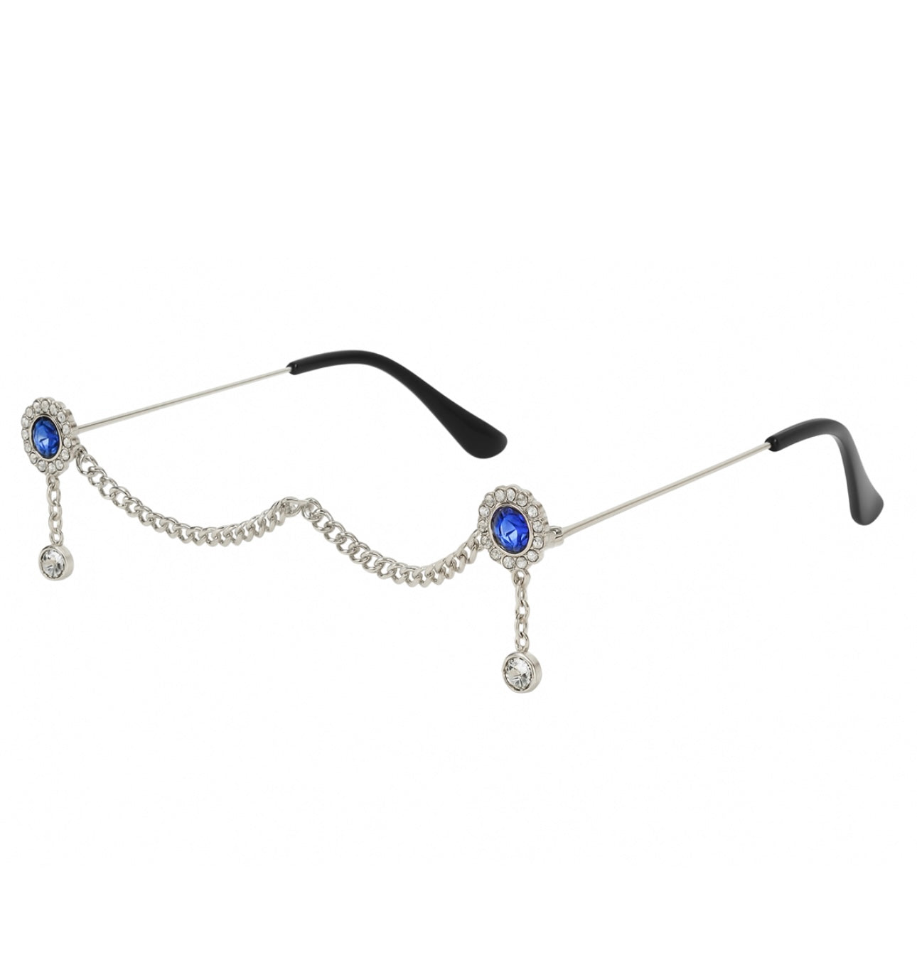 Elevate your look with these stunning Blue Gem Rhinestone Rimless Glasses — featuring silver frames, sparkling crystal chains, and dazzling blue gemstone accents. Lightweight and fashion-forward, perfect for photoshoots or glam events. ✨