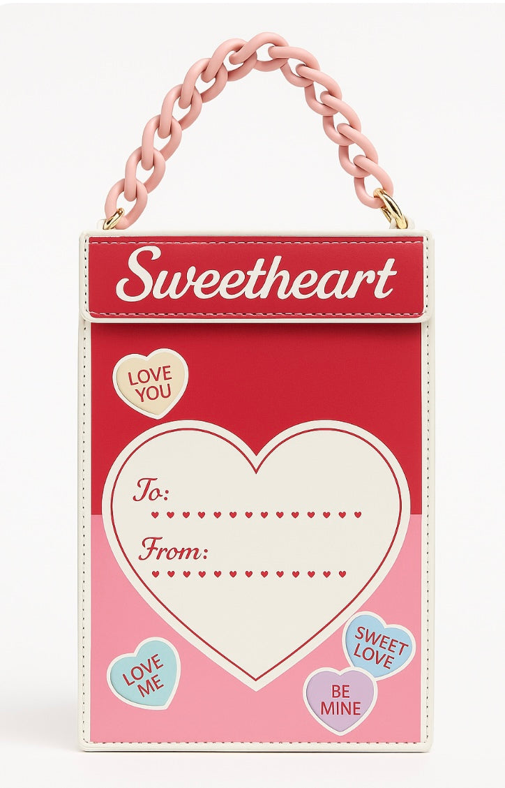 This adorable and bold Sweetheart Candy Purse features a Valentine-style design with bright pink tones, candy-heart graphics. Carry it by the chunky pink handle for a cute handheld look, or attach the long strap to wear it as a crossbody for hands-free convenience.