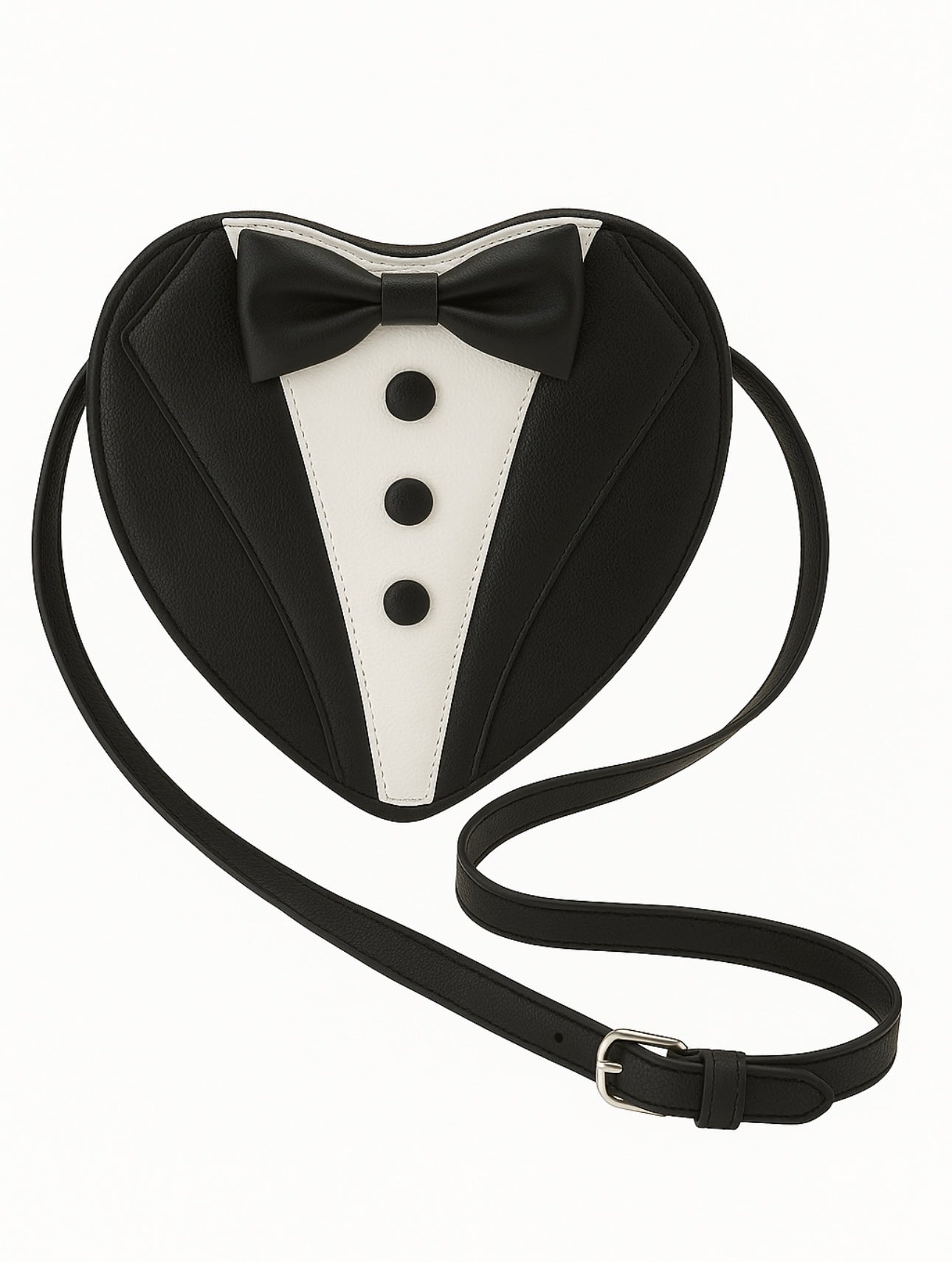 This heart-shaped crossbody with a tuxedo-inspired design, featuring black and white faux leather, a 3D bowtie, raised buttons, an adjustable strap, and a secure zipper for a fun, classy touch.